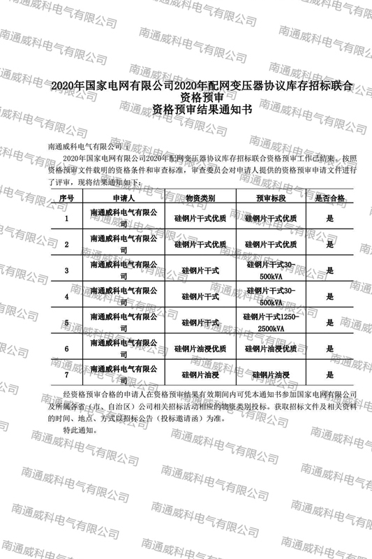 2020年国家电网有限公司2020年配网变压器协议库存招标联合资格预审 资格预审结果通知书